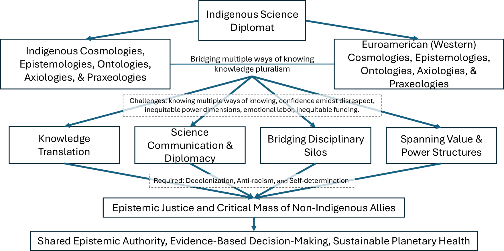 Having been raised in multiple knowledge systems with different cosmologies, epistemologies, ontologies, and axiologies, I have spent my life learning to communicate concepts across multiple ways of knowing, in different disciplines, at different power levels, and across value systems. These experiences in boundary spanning, knowledge translation, and science diplomacy have coalesced into what I call Indigenous Science Diplomacy, something unique requiring a combination of the above skills. This includes understanding multiple knowledge systems, translating between different ways of knowing, bridging gaps across silos (whether disciplinary, institutional), and spanning power structures and systems (such as between minoritized and marginalized communities and scientists and policy makers) (Hatch et al. 2023; Hoffman et al. 2024; Safford et al. 2017). Indigenous Science Diplomacy also requires translating knowledge, science, and evidence into different epistemologies, ontologies, and axiologies, not only code-switching but decontextualizing and then recontextualizing knowledge (Burke 2009; Kennedy et al. 2024). This practice moves information in both directions and is relevant to multiple ways of knowing and those in different power structures and systems (i.e., the community and policy-makers). However, without science communication skills, translating complex scientific concepts across ways of knowing to non-experts would also not be possible (Hatch et al. 2023). Finally, science diplomacy is a critical skill, bringing science into policy space and using “science cooperation to help build bridges and enhance relationships between and amongst societies” (Turekian as cited in CORDIS 2009). But what makes an Indigenous Science Diplomat unique? They can boundary span, translate knowledge, communicate science, and be science diplomats for scientific concepts in multiple ways of knowing. Additionally, Indigenous Science Diplomats seem to be expected to be educators, without other parties putting in the work themselves to learn about other ways of knowing.