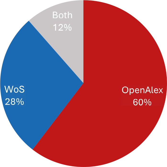 Figure 1. Percentage of studies found in both WoS and OpenAlex (grey), or only in WoS (blue) or OpenAlex (red).