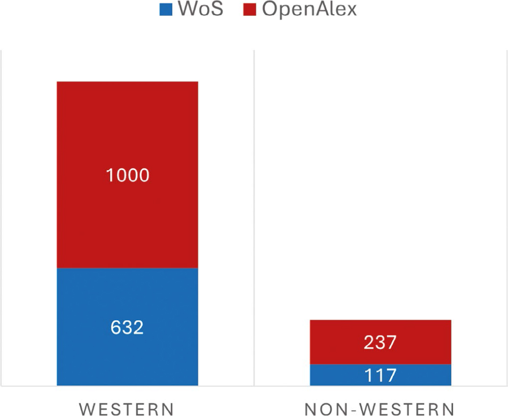 A visual representation of the geographic spread (Western or non-Western) between the two databases can be found in Figures 3 to 6. Certain differences remained, however: OpenAlex did not find articles of 6 country affiliations that were found in WoS (all non-Western countries; see Appendices A and B), and WoS did not find articles of authors of 21 country affiliations (16 non-Western affiliations; see Appendices A and B) that were found in OpenAlex (Appendices A and B). These differences have been observed before. Maddi et al. (2025) observed a more inclusive indexing of OA journals in OpenAlex when they compared it to WoS and Scopus; however, they also observed an underrepresentation of certain regions and (emerging) countries in OpenAlex compared to WoS and Scopus. Therefore, it is recommended in evidence-based practices to always use a variation of databases for an inclusive literature search. Moreover, multilingual or regionally focused databases can be a source for additional non-Western literature. Examples include the databases Scientific Electronic Library Online (SciELO) (Didier 2025), which indexes articles published in journals from countries within the SciELO network; Latin America and the Caribbean Health Sciences Literature (LILACS), which indexes articles in journals published in Latin America and the Caribbean; African Journals Online (AJOL) (Alonso-Álvarez 2025), which indexes articles in journals published in Africa; and China National Knowledge Infrastructure (CNKI), which indexes articles in journals published in China.