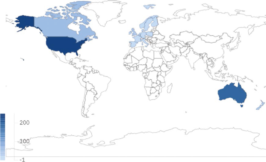 Figure 4. Geographic distribution of Western country affiliations in search results from WoS. Image generated via the free version of Draxlr.