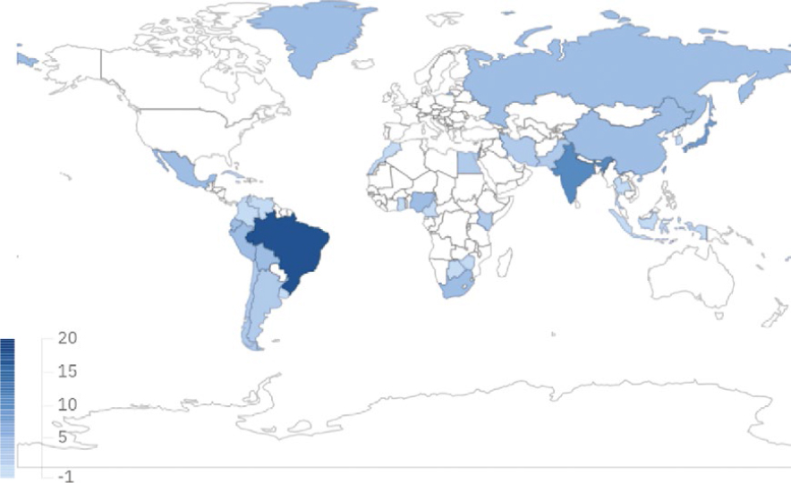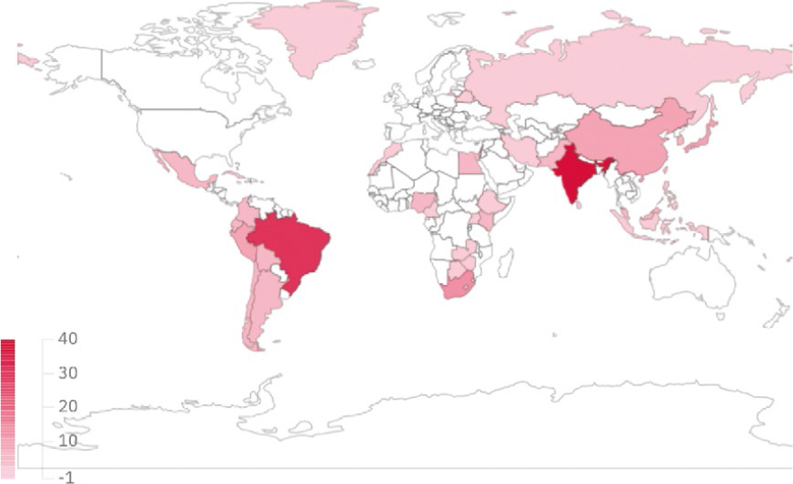 Figure 6. Geographic distribution of non-Western country affiliations in search results from WoS. Image generated via the free version of Draxlr.