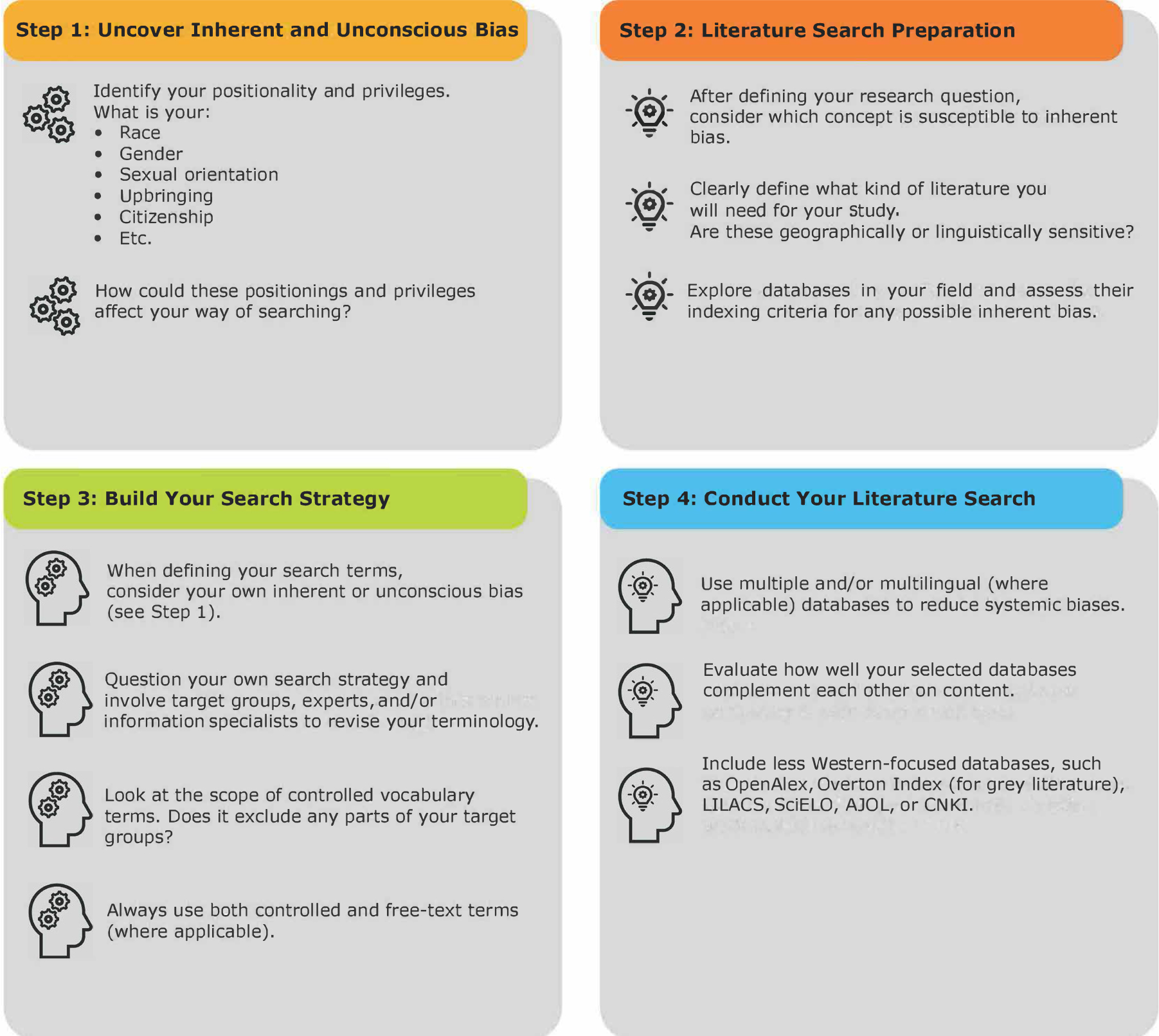 Figure 7. Key steps and considerations when preparing and conducting a literature search to ensure a more inclusive literature retrieval.