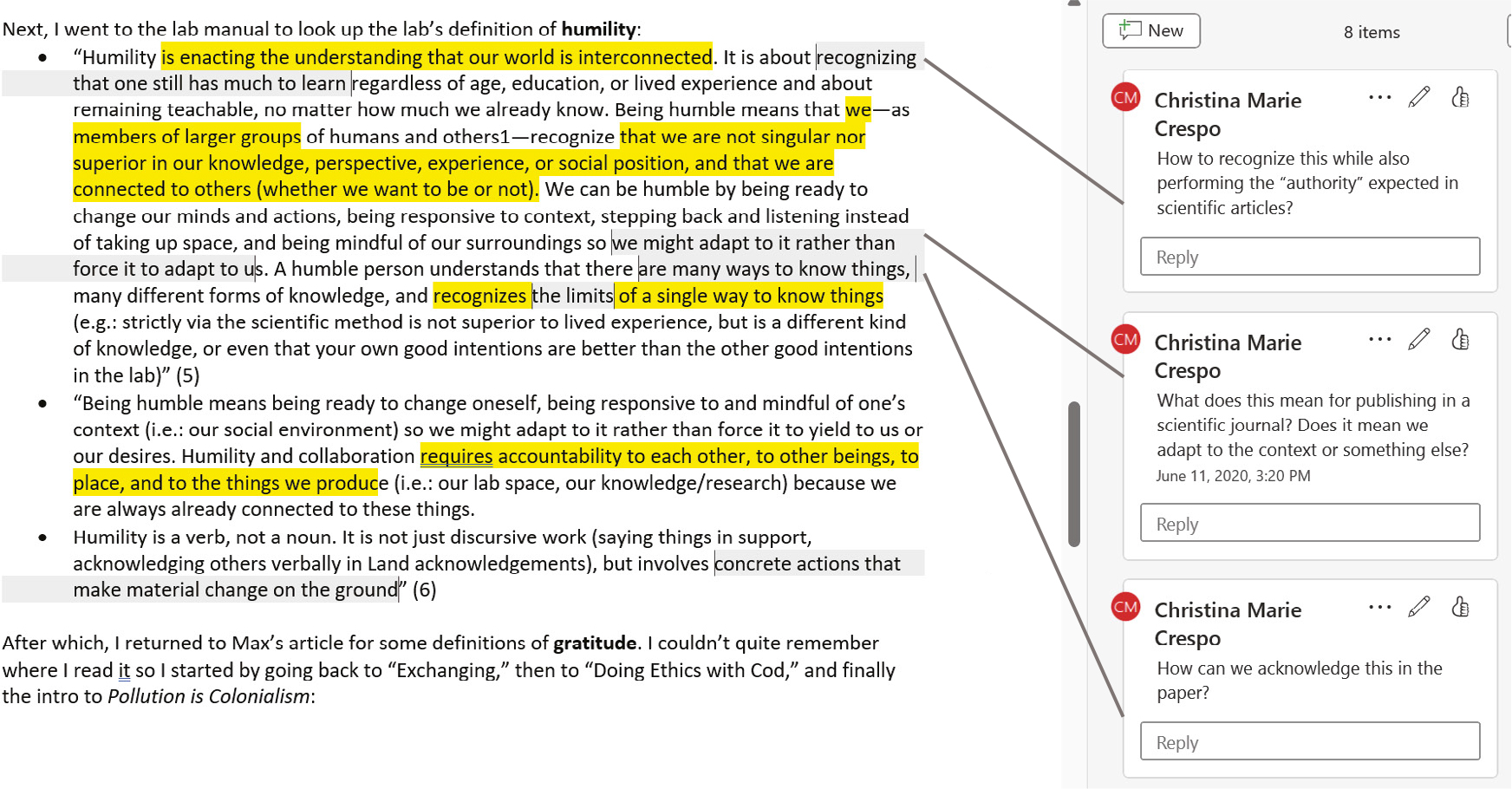 Figure 1. Christina’s annotations to the CLEAR Lab Book’s definition of humility in an effort to bring this value into lab-wide citation practices.